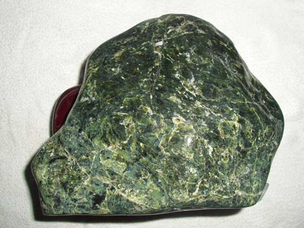 蛇紋石質(zhì)玉石質(zhì)地呈細(xì)膩的致密塊體,質(zhì)地細(xì)膩,用手觸摸有滑感。它由細(xì)小纖維狀、葉片狀和膠狀蛇紋石晶體組成,呈網(wǎng)斑狀結(jié)構(gòu)。有時(shí)在均勻分布的基底上,可見(jiàn)密集堆積的云朵狀白色斑狀。少數(shù)纖維狀塊體琢磨后有貓眼效應(yīng)。